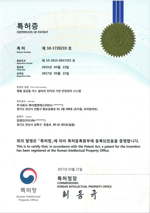 병원 공급용가스 설비의 인터넷 기반 안전관리 시스템 -특허증 페이지 정보 (주)케이엠엔텍 메일보내기 아이디로 검색 630 2025.07.30 11:40 첨부파일 스크린샷_30-7-2025_111046_.jpeg (755.0K) 11 2025-07-30 11:40:18 × 짧은 글주소 복사 Note! 위 주소를 클릭 후, 복사(Ctrl+C)하여 사용하세요. 이전글다음글 목록 본문 병원 공급용가스 설비의 인터넷 기반 안전관리 시스템 -특허증
